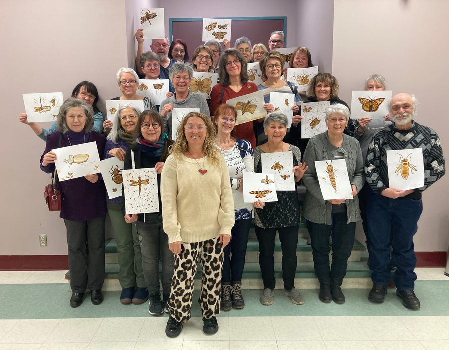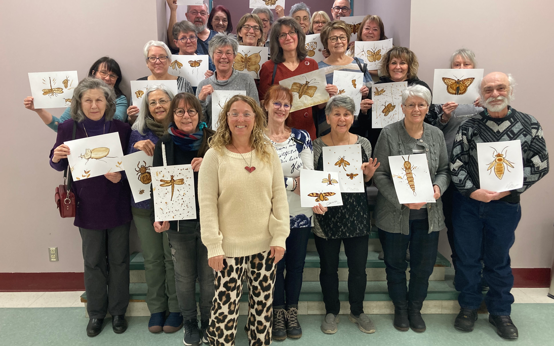 Le groupe de participant.es aux ateliers d'expression artistique organisés par la MRC des Appalaches à Thetford Mines pose fièrement avec l'artiste peintre et enseignante en arts, Annie Rodrigue, qui les initie à différentes techniques en arts visuels et en métiers d'art.