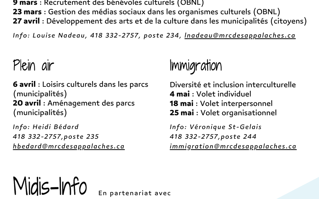 La MRC des Appalaches est heureuse d'annoncer le retour de ses Midis-Info. En effet, une série de séances d'information virtuelles seront présentées durant les prochaines semaines, et ce, jusqu'au printemps. Accessibles en ligne et abordant divers sujets tels la culture, le plein air et l'immigration, les Midis-Info se dérouleront sur l'heure du dîner les jeudis.
