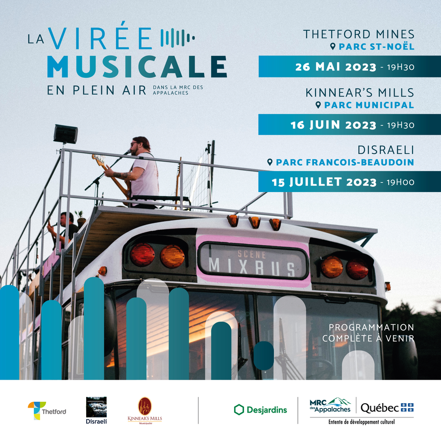 La MRC des Appalaches est heureuse de lancer son tout nouveau projet culturel La Virée musicale en plein air concocté spécialement pour les jeunes de la région. Trois spectacles seront ainsi présentés sur la scène du Mixbus au cours de l'été et mettront en vedette des artistes locaux de la relève œuvrant dans différentes disciplines tels la musique, la danse et les arts du cirque. Les spectacles se tiendront dans trois parcs municipaux de la région situés à proximité d'une rivière.