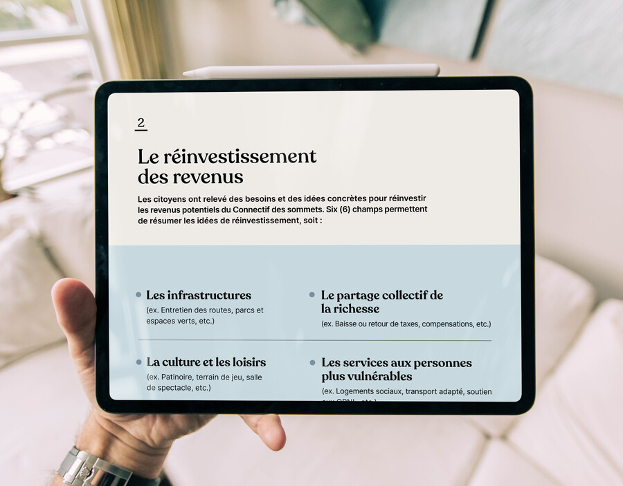 Enfin il est possible de poursuivre le dialogue et de suivre les derniers développements concernant la création du Connectif des sommets ou les projets éoliens et consulter le bilan en se rendant directement sur le site Web évolutif du Connectif des sommets à connectif.ca. Quelques copies papier du bilan seront également disponibles au bureau de la MRC pour les personnes n'ayant pas accès à la version numérique.