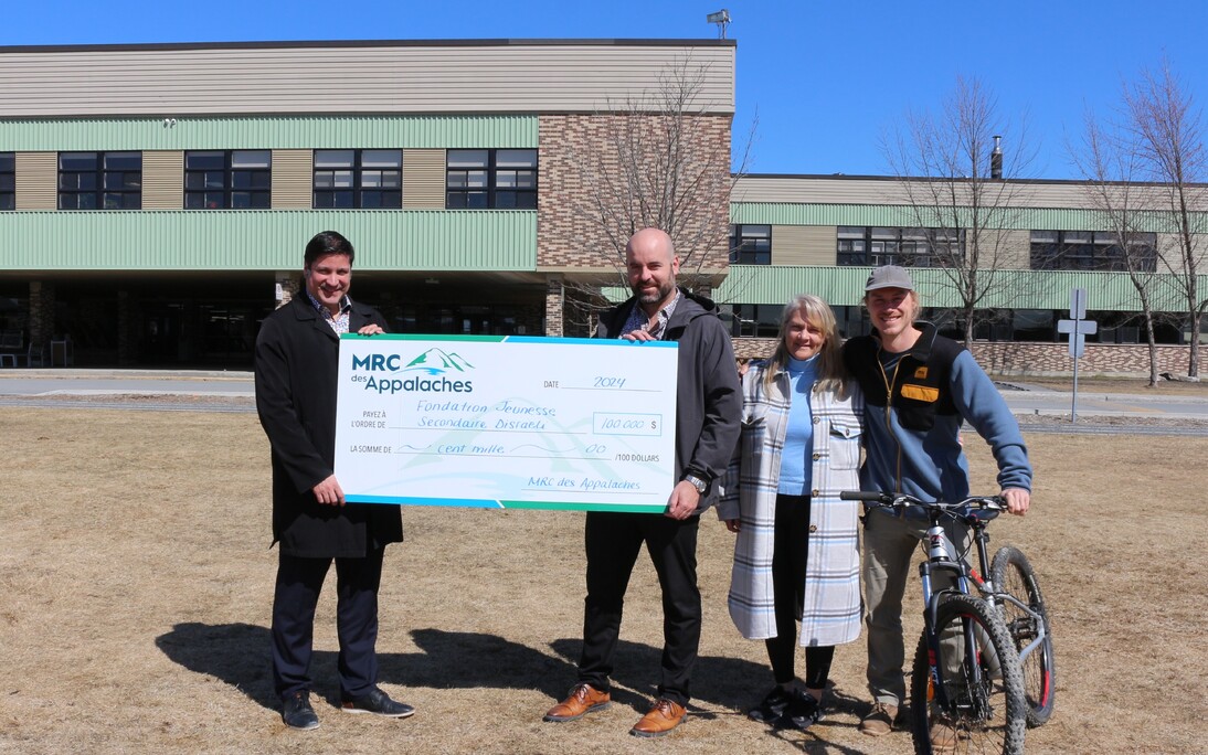 Dans le cadre de son appel à projets pour le Fonds plein air 2023-2025, la MRC des Appalaches est heureuse d'annoncer l'octroi d'une aide financière de 100 000 $ à la Fondation Jeunesse Secondaire Disraeli. L'aide financière servira principalement à l'aménagement d'une piste d'habileté pour vélo sur le terrain de la Polyvalente de Disraeli et à l'achat d'équipements pour la concentration plein air.
