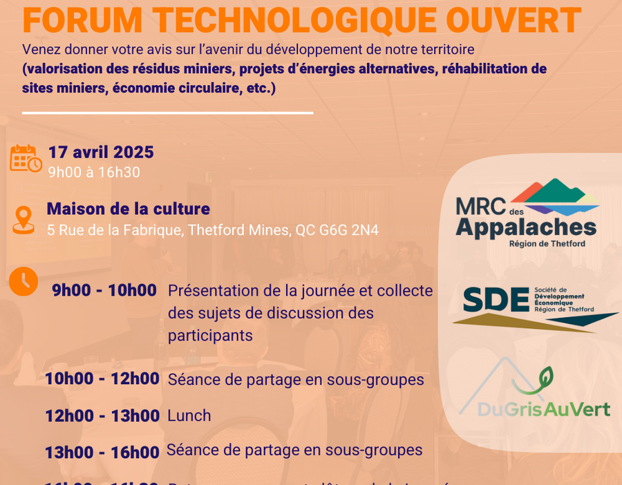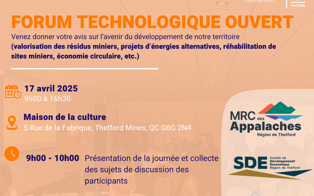 Le forum technologique ouvert se tiendra le 17 avril prochain, de 9 h à 16 h 30, à la Maison de la culture de Thetford Mines est gratuit et destiné à tous les citoyens de la région souhaitant donner leur avis sur l'avenir du développement du territoire.