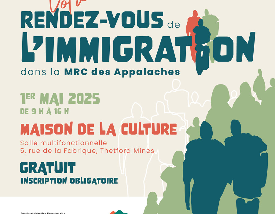 Pour en savoir plus sur l'événement, consulter la page Facebook de la MRC des Appalaches. Pour toute information supplémentaire, veuillez communiquer avec madame Véronique St-Gelais, chargée de projet en immigration au 418 332-2757, poste 244 ou par courriel à immigration@mrcdesappalaches.ca. L'inscription est obligatoire via le lien suivant : https://forms.gle/hMqkRcq79XA4kA6V6.