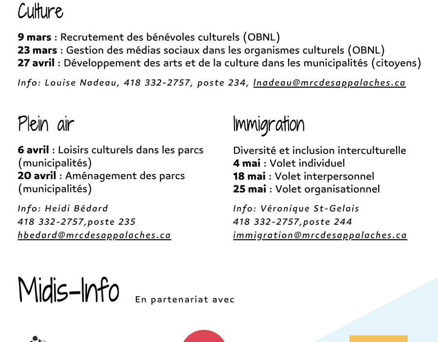 La MRC des Appalaches est heureuse d'annoncer le retour de ses Midis-Info. En effet, une série de séances d'information virtuelles seront présentées durant les prochaines semaines, et ce, jusqu'au printemps. Accessibles en ligne et abordant divers sujets tels la culture, le plein air et l'immigration, les Midis-Info se dérouleront sur l'heure du dîner les jeudis.
