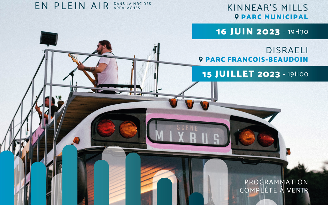 La MRC des Appalaches est heureuse de lancer son tout nouveau projet culturel La Virée musicale en plein air concocté spécialement pour les jeunes de la région. Trois spectacles seront ainsi présentés sur la scène du Mixbus au cours de l'été et mettront en vedette des artistes locaux de la relève œuvrant dans différentes disciplines tels la musique, la danse et les arts du cirque. Les spectacles se tiendront dans trois parcs municipaux de la région situés à proximité d'une rivière.