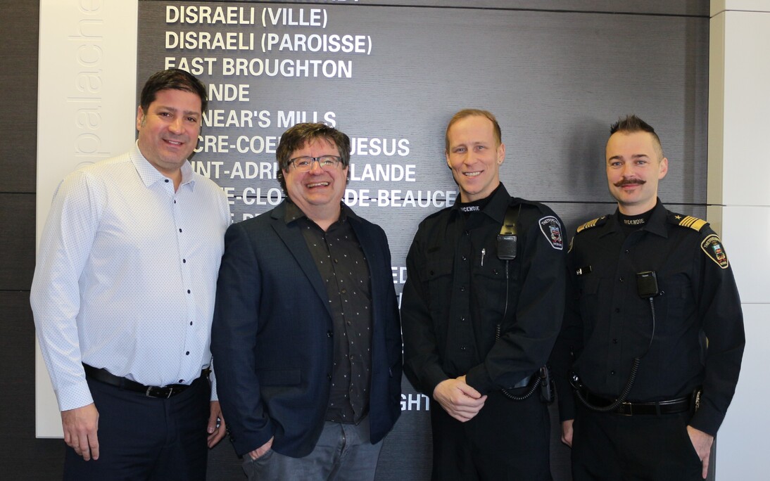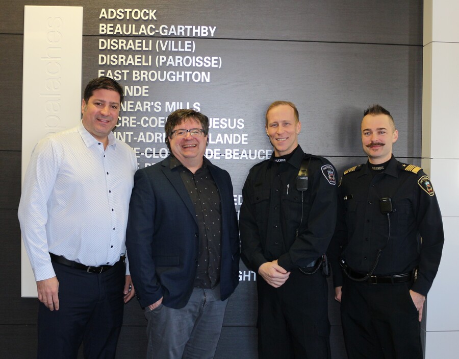 De gauche à droite sur la photo : Marc-Alexandre Brousseau, maire de la Ville de Thetford et préfet de la MRC des Appalaches, Rick Lavergne, directeur général de la MRC des Appalaches, Jonathan Boivin, pompier-préventionniste à la Ville de Thetford et Kyle Landry, directeur du Service de la sécurité incendie à la Ville de Thetford.
