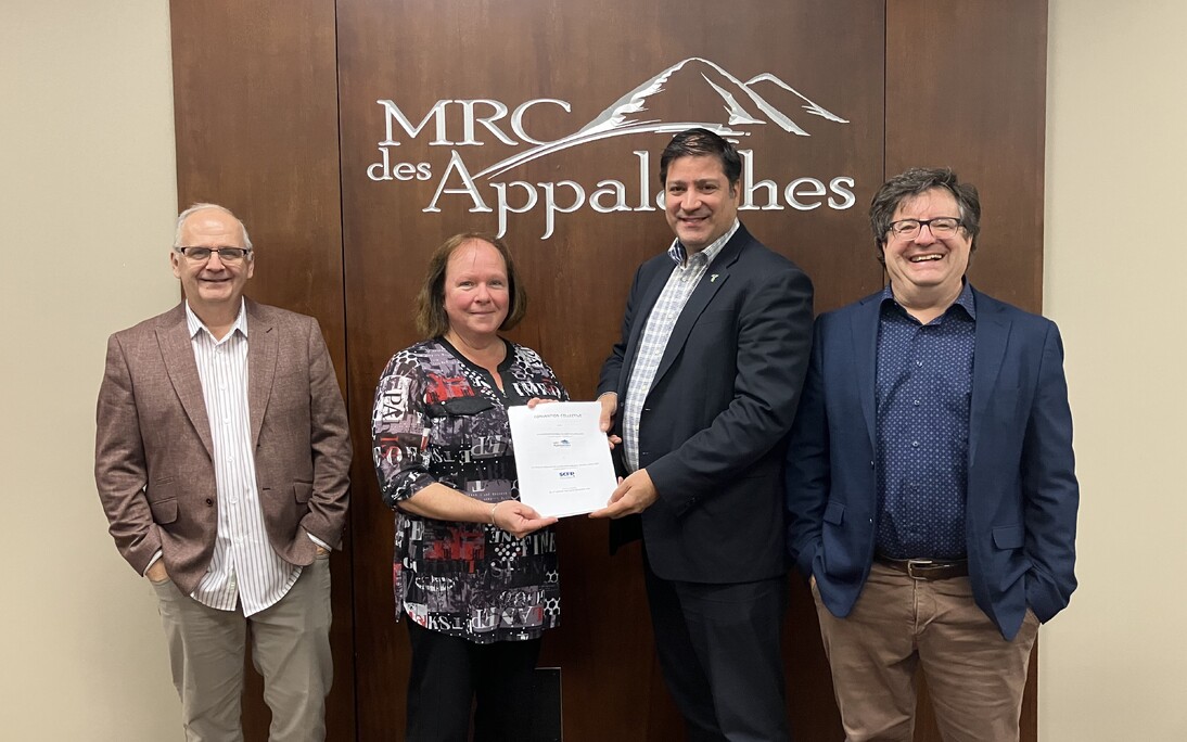 Sur la photo, de gauche à droite : Mario Jean, conseiller syndicale SCFP, Renée Vachon, présidente du SCFP 3647, Marc-Alexandre Brousseau, préfet de la MRC des Appalaches et maire de la Ville de Thetford Mines et Rick Lavergne, directeur général de la MRC des Appalaches.
